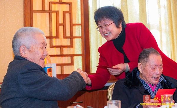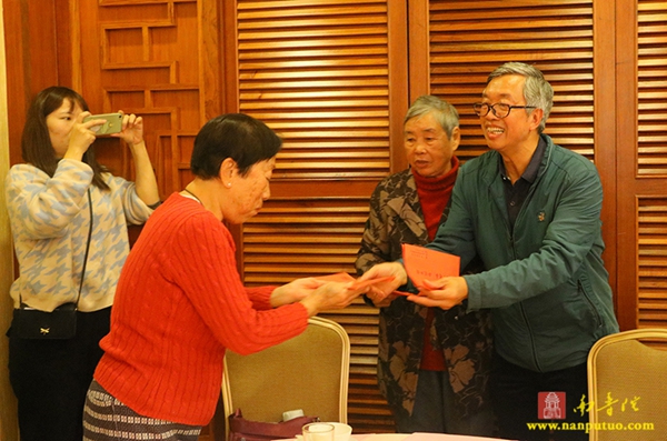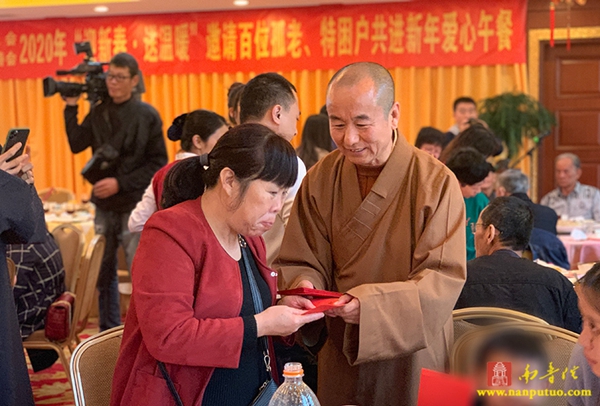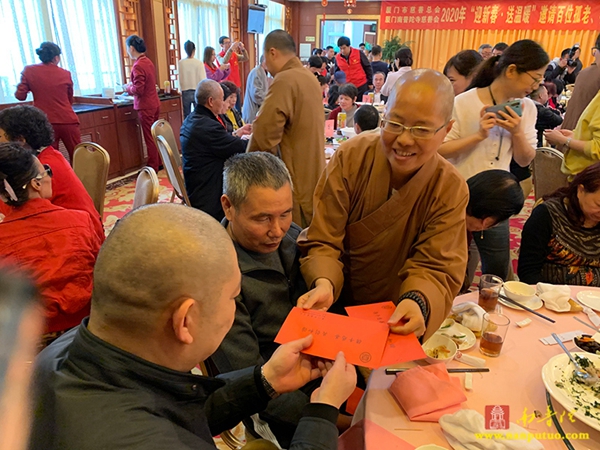 席间大家举杯同祝新年、互送祝福,脸上都洋溢着幸福满足的笑容。在厦门市福利院住了20年的沈大爷今年已经92岁高龄,他说:“每一年的慈善午宴都受邀参加,今年是‘爱心厦门’提出后的首次午宴,意义更为特别,生活在厦门的老人都很幸福,千好万好,社会主义大家庭最好,这场午宴让大家有浓浓的获得感、幸福感,福利院的老人们都精心穿着打扮,用新面貌迎接鼠年到来。”席间,则悟大和尚、杨金兴会长、李丽红副局长等来到长者和困难群众中,给大家发放慰问金,送上新年祝福。午宴结束后,还为孤老和困难户发放了慰问品。